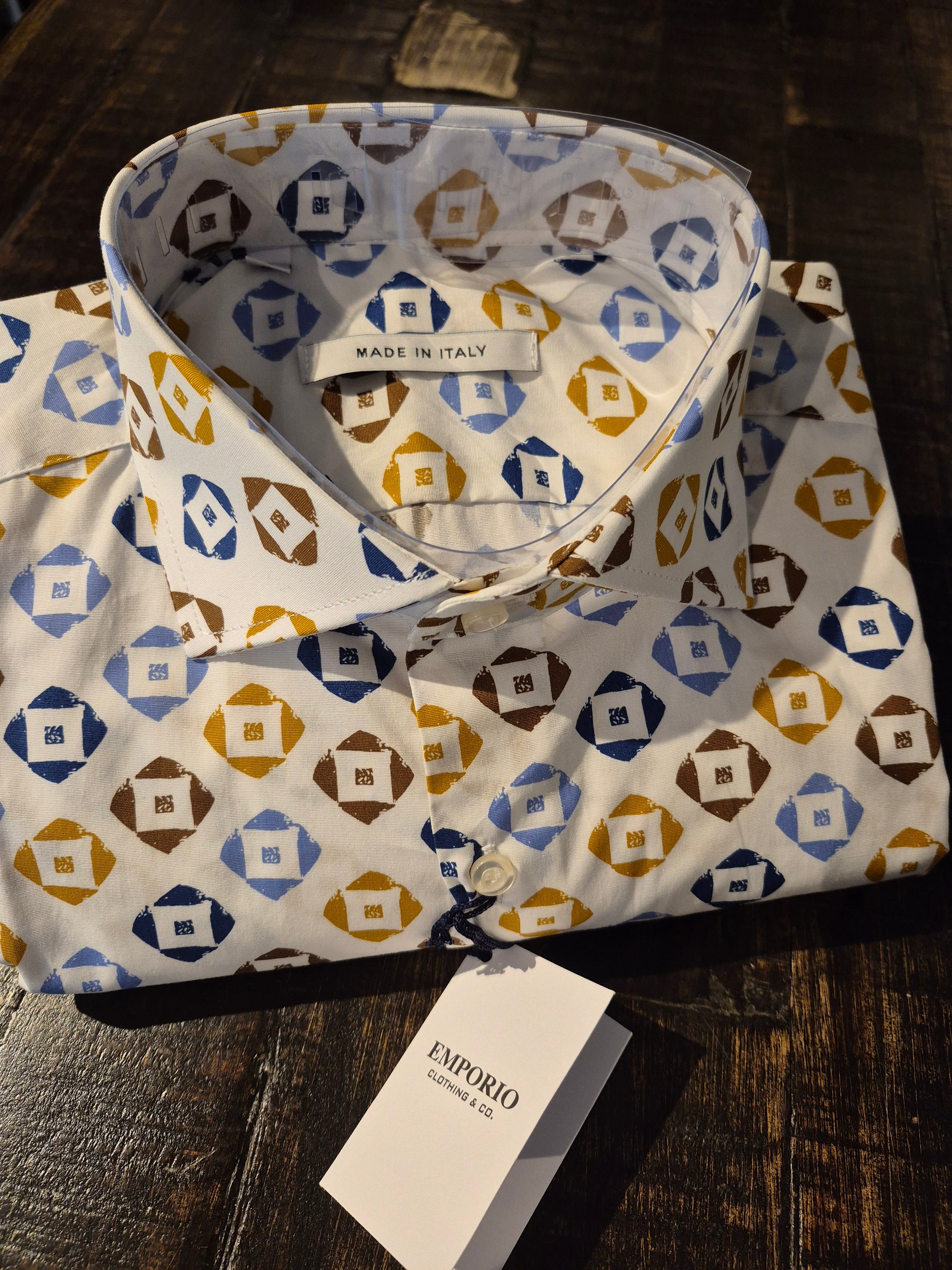 Hemd Emporio Slim-Fit, Made in Italy, Stylisch, Modern im geometrischen Design weiss blaubraun gelb